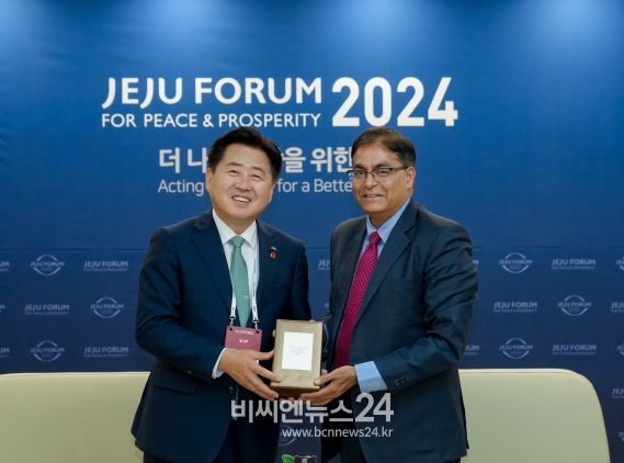 오영훈 지사는 29일 오후 제주국제컨벤션센터 VIP룸에서 ‘제19회 평화와 번영을 위한 제주포럼’ 세션 참석차 제주를 방문한 아밋 쿠마르(Amit Kumar) 주한 인도 대사와 면담했다.