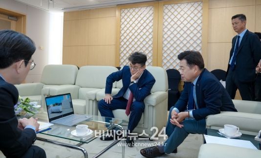 먼저 오전에는 제주국제컨벤션센터 VIP룸에서 효성하이드로젠 임효성 상무이사와 수소엔진 발전 기술 도입과 실증사업 추진 방안을 논의했다.