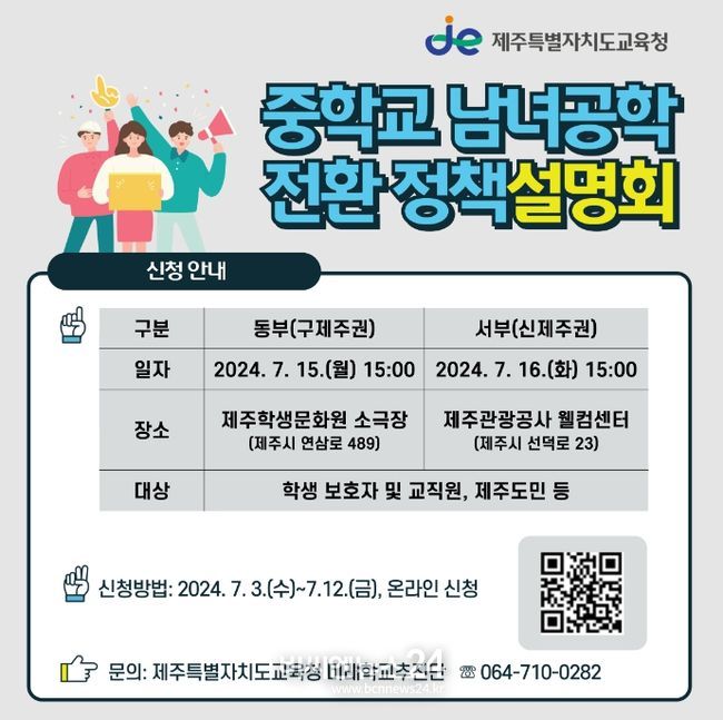 (비씨엔뉴스24) 제주특별자치도교육청은 7월 15일 오후 3시 제주학생문화원 소극장, 16일 오후 3시 제주관광공사 웰컴홀에서 학생 보호자 및 교직원, 제주도민 등을 대상으로 2차에 걸쳐 ‘중학교 남녀공학 전환 정책설명회’를 개최한다.