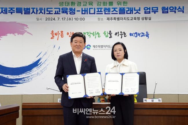 (비씨엔뉴스24) 제주특별자치도교육청과 버디프렌즈플래닛는 17일 제주특별자치도교육청 상황실에서 제주도 생태환경 교육 강화를 위한 업무협약을 체결했다.