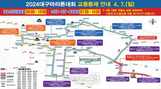 (비씨엔뉴스24) 다가오는 4월 7일 2024 대구마라톤대회 개최로 인해 대구스타디움 일원과 수성구, 중구, 동구 등 도심 일대 교통이 통제된다.