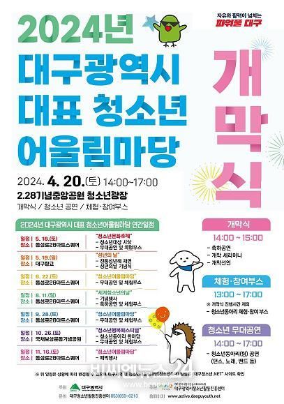(비씨엔뉴스24) 대구광역시가 주최하고 대구청소년활동진흥센터가 주관하는 ‘2024년 대구 대표 청소년어울림마당 개막식’이 4월 20일오후 2시, 2·28기념중앙공원에서 열린다.