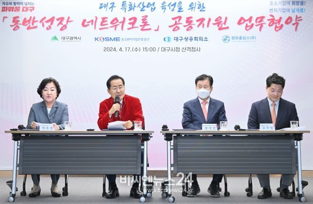 (비씨엔뉴스24) 대구광역시와 중소벤처기업진흥공단, 대구상공회의소 및 평화홀딩스(주)는 4월 17일 오후 3시 대구광역시 산격청사에서 전국 최초로 ‘특화산업 육성을 위한 동반성장 네트워크론 공동지원 업무협약’을 체결했다.