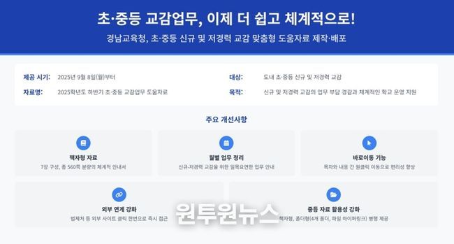 (원투원뉴스) 경상남도교육청은 오는 8일부터 도내 초·중등 교감의 업무 수행을 지원하기 위해 ‘2025학년도 하반기 초·중등 교감 업무 도움 자료’를 제작하여 배포한다.
