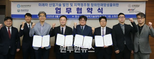 (원투원뉴스) 경상국립대학교 미래차 라이즈(RISE)사업(책임교수 김해지 미래자동차공학과 수)는 9월 9일 동원과학기술대학교에서 경상국립대학교, 경남대학교, 인제대학교, 동원과학기술대학교와 함께 ‘미래차 산업기술 발전 및 지역정주형 창의인재 양성을 위한 업무협약’을 체결했다.