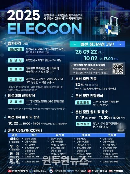 (원투원뉴스) 한국전력(대표이사 사장 김동철)이 사이버보안 전문인력 양성과 에너지분야 협력체계를 강화하기 위하여 국정원 지부와 공동으로 ‘2025년 실전형 사이버공격 방어훈련’(ELECCON 2025)을 개최한다.