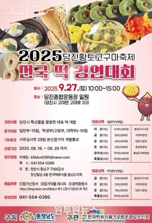 (원투원뉴스) 당진시는 오는 27일 오전 10시 50분부터 오후 3시까지 당진종합운동장 일원에서 ‘2025년 전국 떡 경연대회’를 개최한다고 24일 밝혔다.