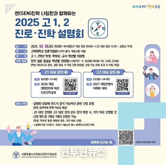 (원투원뉴스) 서울특별시교육청 산하 교육연구정보원은 2025학년도 고 1, 2 학생들의 진로·진학 학업 설계를 위한 맞춤형 통합지원을 추진하고 있다.