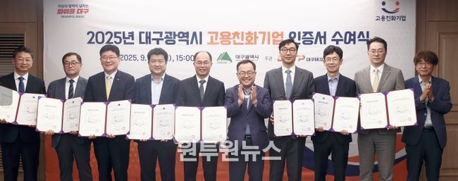 (원투원뉴스) 대구광역시는 9월 29일 오후 3시, 시청 산격청사에서 ‘2025년 고용친화기업 인증서 수여식’을 열고, 고용 창출 및 근무환경이 우수한 고용친화기업 신규 5개사와 재인증 6개사를 선정해 인증서를 수여했다.