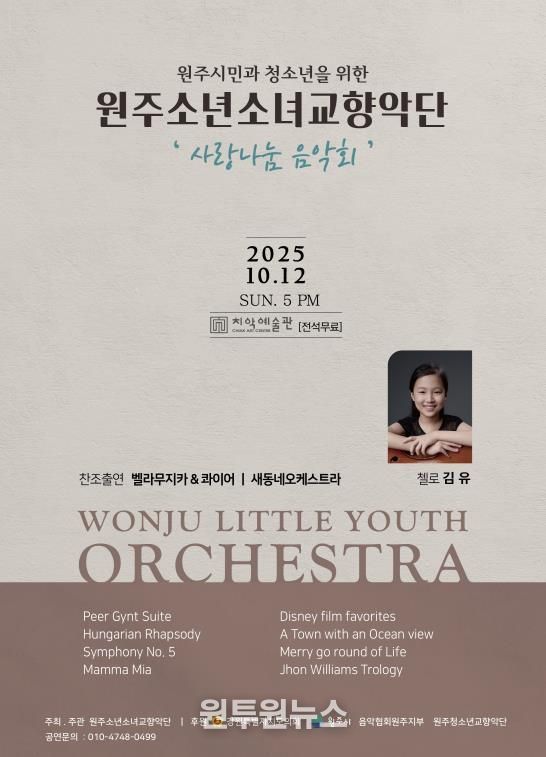 (원투원뉴스) 원주소년소녀교향악단은 오는 12일 오후 5시, 치악예술관에서 ‘사랑나눔음악회’를 통해 지역사회와 함께하는 따뜻한 무대를 마련한다.