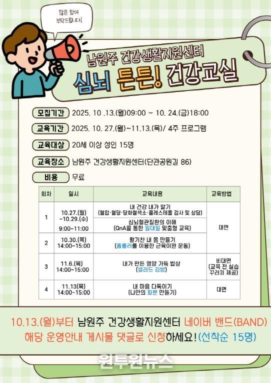 (원투원뉴스) 남원주건강생활지원센터는 심뇌혈관질환의 이해·예방과 건강관리를 돕기 위해 10월 27일부터 11월 13일까지 ‘심뇌 튼튼! 건강교실’을 운영한다.