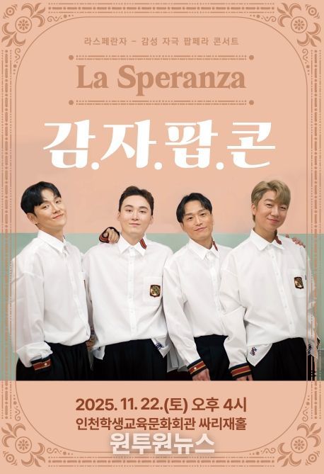 (원투원뉴스) 인천광역시교육청학생교육문화회관은 11월 22일 오후 4시, 대공연장 싸리재홀에서 대한민국 최초의 팝페라팀 라스페란자의 공연 ‘라스페란자 감자팝콘’을 개최한다.