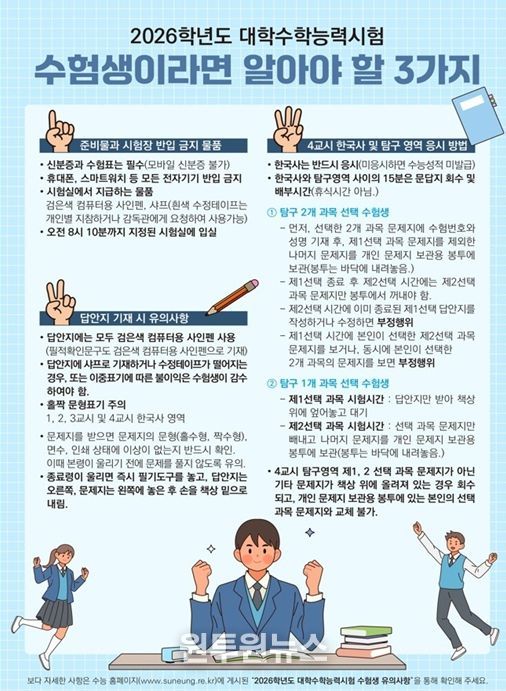 (원투원뉴스) 세종특별자치시교육청은 11월 13일에 실시되는 2026학년도 대학수학능력시험을 수험생들이 안정적으로 치를 수 있도록 ‘수험생 유의사항’을 안내했다.