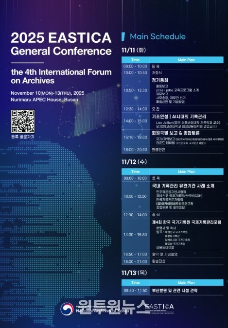 (원투원뉴스) 행정안전부 국가기록원은 11월 10일부터 13일까지 부산 누리마루 APEC 하우스에서 '2025년 동아시아기록관리협의회(EASTICA) 정기총회 및 제4회 한국 국가기록원 국제기록관리포럼'을 개최한다고 밝혔다.