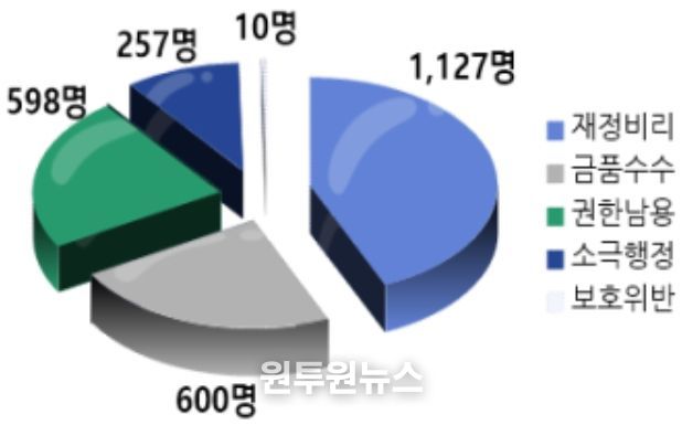 분야별 상세 단속 인원 현황을 살펴보면 ①공직비리 분야는 △재정비리 1,127명(송치 193) △금품수수 600명(송치 205) △권한남용 598명(송치 78) △소극행정 257명(송치 6) △제보자보호위반 10명(송치 3) 순으로, ②불공정비리 분야는 △불법 리베이트 516명(송치 259) △채용비리 154명(송치 33) △불법투기 2명 순으로, ③안전비리 분야는 △부실시공 551명(송치 457) △안전담합 25명(송치 19) 순으로 단속 인원이 많은 것으로 확인됐다.