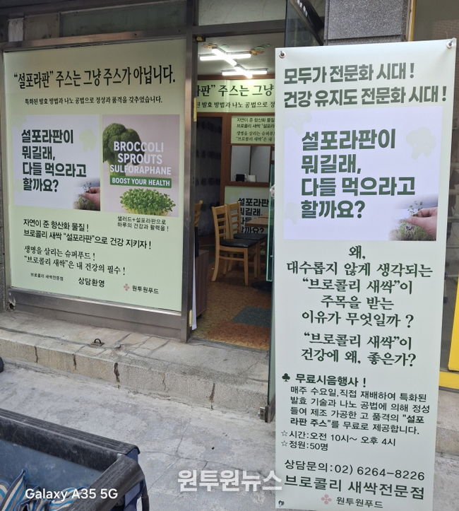 이번 1호점 개설을 주관한 원투원푸드 직영 전문점은 일반적으로 대수롭지 않게 여겨지는 브로콜리는 새싹에서 ‘설포라판’이 풍부하여 건강의 효능으로 인기를 끌고 있는 가운데 이번에 브로콜리 새싹을 특수한 농법으로 직접 재배하여 브로콜리 새싹 주스와 샐러드만 취급하는 전문점이다.