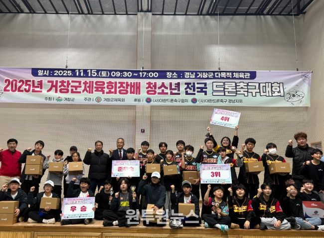 (원투원뉴스) 거창군은 지난 15일 거창스포츠파크 다목적체육관에서 거창군체육회 주관으로 ‘2025년 거창군체육회장배 청소년 전국 드론축구대회’가 성황리에 개최됐다고 밝혔다.