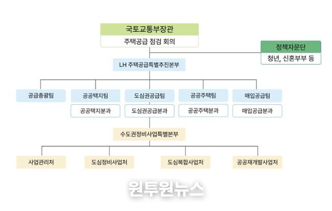 국토부는 속도감 있는 공급을 위해 현행 공공주택추진단 등으로 분산된 공급 전담 기능을 대폭 강화하는 방안을 관계 부처와 협의 중이며, LH는 사장 직무대행이 본부장을 맡는 주택공급특별대책본부를 즉시 신설하고, 5개 팀을 신설해 핵심과제를 전담 관리한다.
