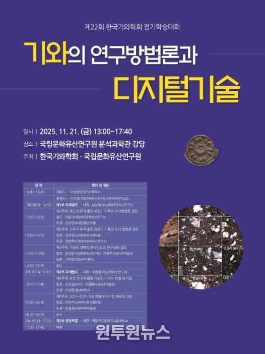 (원투원뉴스) 국가유산청 국립문화유산연구원은 한국기와학회와 함께 11월 21일 오후 1시, 국립문화유산연구원 분석과학관 강당(대전 유성구)에서 '한국기와학회 제22회 정기학술대회'를 공동 개최한다.
