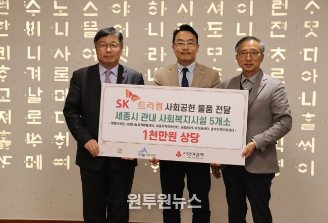 (원투원뉴스) 세종사회복지공동모금회(회장 박상혁, 이하 세종모금회)에 따르면 11월 20일 세종특별자치시 세종시청 접견실에서 이승원 세종특별자치시 부시장, 하정환 SK트리켐 대표, 김윤회 세종모금회 부회장이 참석한 가운데 ‘세종시 관내 사회복지시설 1천만원 상당 물품전달식’을 가졌다.