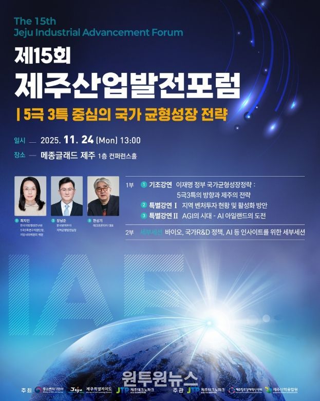(원투원뉴스) 제주테크노파크(원장 지영흔, 제주TP)는 오는 24일 메종글래드 제주 1층 컨퍼런스홀에서 ‘5극 3특 중심의 국가 균형성장 전략’을 주제로 제15회 제주산업발전포럼을 개최한다.