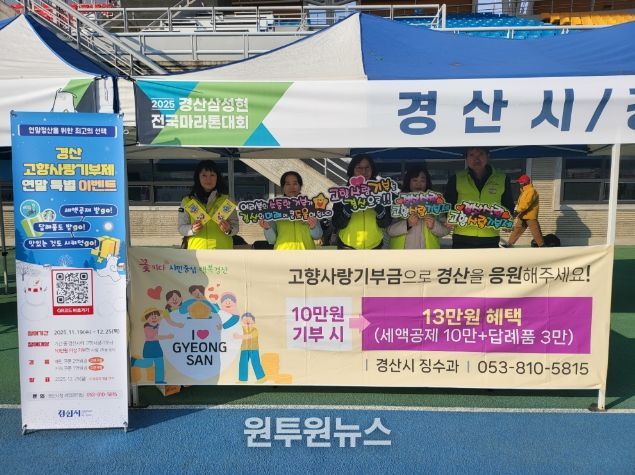 (원투원뉴스) 경산시는 23일 경산시민운동장에서 시작하여 경산시 일대를 돌아오는 2025 삼성현 전국 마라톤대회에서 경산 고향사랑기부제 홍보를 실시했다.