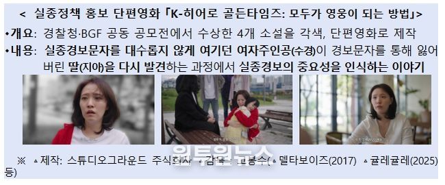 특히, 「K-히어로 골든타임즈: 모두가 영웅이 되는 방법」은 이날 처음 공개하는 단편영화로, 여자주인공(수경)이 실종경보문자를 통해 잃어버린 딸(지아)을 발견하면서 실종경보의 중요성을 깨닫는 이야기를 담았다.