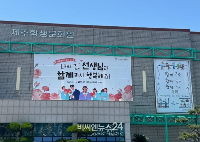 (비씨엔뉴스24) 제주특별자치도교육청은 제43회 스승의 날을 맞이하여 스승에게 감사의 마음을 전하기 위해『나의 길, 선생님과 함께라서 행복해요!』라는 주제로 5월 14일 15시 30분에 제주학생문화원 대극장에서‘제43회 스승의 날 기념행사’를 개최한다. 이번 행사에는 스승의 날 기념 유공 교원 및 내·외빈 500여 명이 참석할 예정이며, 1부 축하공연, 2부 기념식 순으로 진행된다.
