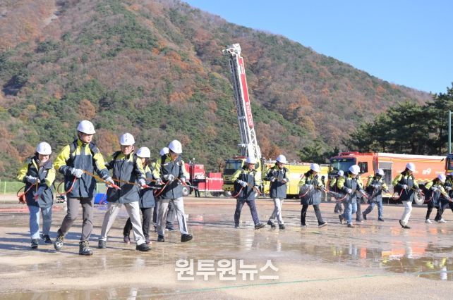 (원투원뉴스) 경상남도 소방본부는 가을철 건조한 날씨로 인한 대형산불 발생에 대비해 11월 28일 경남소방교육훈련장에서 산불 대응 소방전술 시연회를 개최했다.