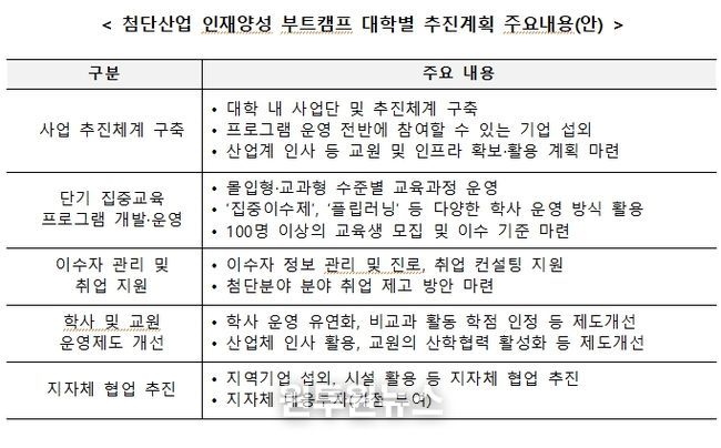 (원투원뉴스) 교육부와 한국산업기술진흥원(원장 민병주)은 12월 11일에 ‘2026년 첨단산업 인재양성 부트캠프’ 운영계획을 발표하고, 공고를 통해 참여대학을 모집한다.