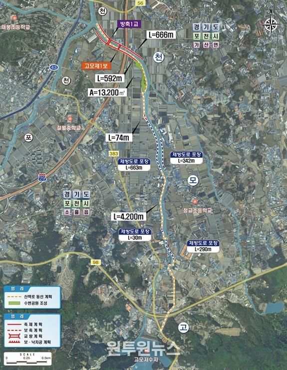정비사업은 포천시 소흘읍 고모리에서 가산면 일원까지 총 연장 4.1km 구간을 대상으로 추진된다. 하천 제방 1.26km 보강을 통해 고모천의 홍수 대응 능력을 우선 개선하고 하천 유휴지를 활용하여 수변공원과 산책로를 조성해 주민들이 안전하게 이용할 수 있도록 하는 사업이다.