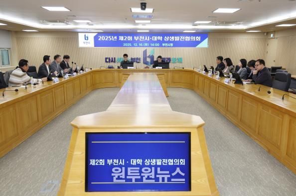 (원투원뉴스) 부천시는 지난 16일 부천시청 창의실에서 가톨릭대학교, 부천대학교, 서울신학대학교, 유한대학교 등 관내 4개 대학과 부천산업진흥원, 부천상공회의소, 부천강소기업협의회 등 주요 산학 기관 관계자들이 참석한 가운데 ‘2025년 제2회 부천시‧대학 상생발전협의회’를 열었다.