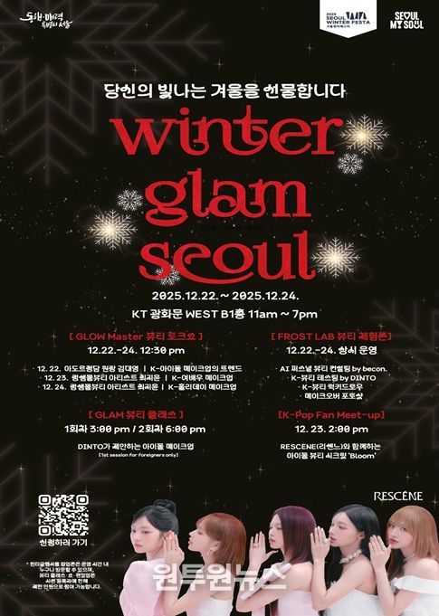 (원투원뉴스) 서울시가 서울윈터페스타를 찾은 국내외 관광객에게 차별화된 한류 경험을 제공하기 위해 K-뷰티를 주제로 한 ‘윈터 글램 서울(Winter Glam Seoul)’ 팝업 행사를 12월 22일부터 24일까지 3일간 개최한다.