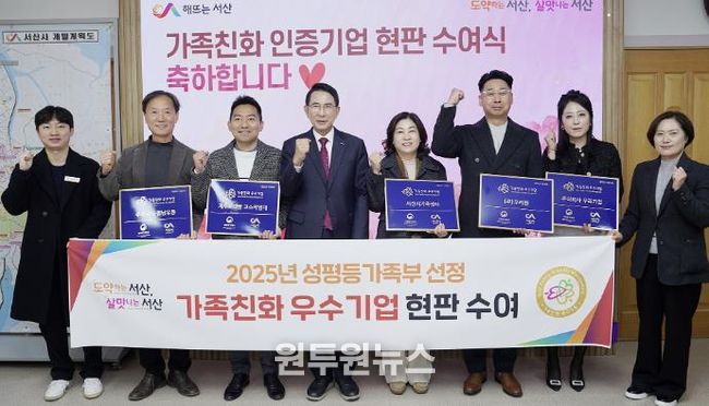 (원투원뉴스) 충남 서산시는 지난 18일 시청 시장실에서 ‘2025년 가족친화 인증기관·기업 현판 수여식’을 개최했다고 밝혔다.