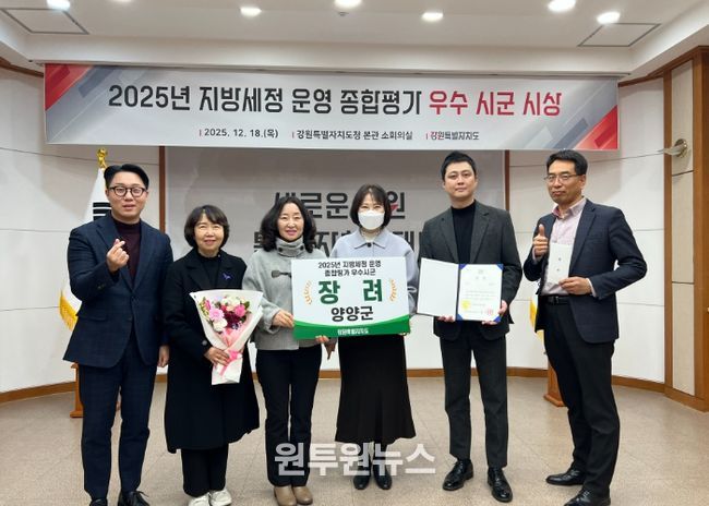 (원투원뉴스) 양양군은 강원특별자치도가 실시한 ‘2025년 지방세정 운영 종합평가’에서 2년 연속 장려상을 수상했다고 18일 밝혔다.