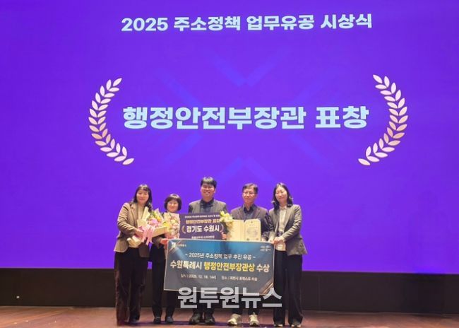(원투원뉴스) 수원특례시가 행정안전부 주관 ‘2025 주소정책 워크숍’에서 ‘2025 주소정책 업무 분야 우수기관’으로 선정돼 행정안전부 장관 표창을 받았다. 특별교부세 4000만 원도 확보했다.