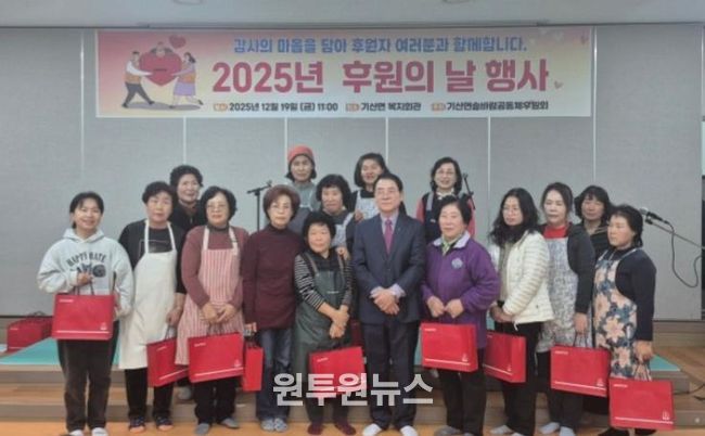 (원투원뉴스) 기산솔바람공동체후원회는 지난 19일 기산면 복지회관에서 후원자들에게 감사의 뜻을 전하고, 함께 식사를 나누며 친목을 도모하는 ‘후원의 날 행사’를 개최했다.