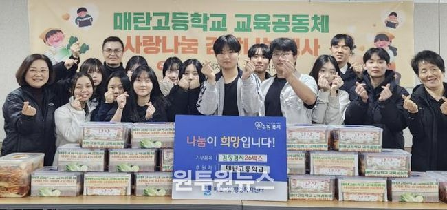 (원투원뉴스) 매탄고등학교는 지난 19일, 교사·학생·학부모가 함께 참여해 마련한 김장김치 26박스를 매탄3동행정복지센터에 전달하며 지역사회에 따뜻한 나눔을 실천했다.