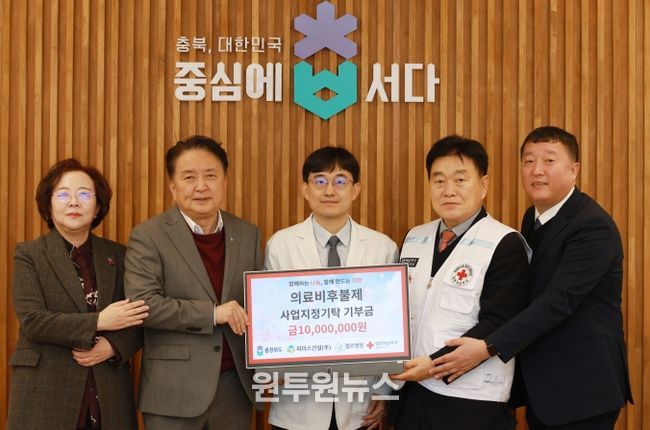 이날 기탁식에는 김영환 충북도지사, 장현봉 대한적십자사 충북지사 회장, 기영진 첼로병원장, 박기철 리더스건설 주식회사 대표이사 등이 참석했다.