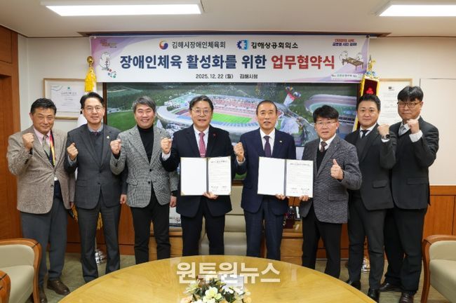 (원투원뉴스) 김해시장애인체육회는 22일 오전 10시 김해시청에서 김해상공회의소(회장 노은식)와 장애인체육 활성화를 위한 업무협약을 체결했다.