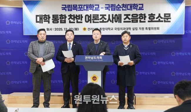 (원투원뉴스) 전라남도의회 통합대학교 국립의과대학 설립 지원 특별위원회는 교육부 통폐합 심사위원회 결정을 앞두고 오늘부터(22~23일) 진행 중인 국립목포대학교–국립순천대학교 통합 찬반 투표와 관련해, 양 대학 구성원의 적극적인 관심과 참여를 촉구하는 호소문을 12월 22일 발표했다.