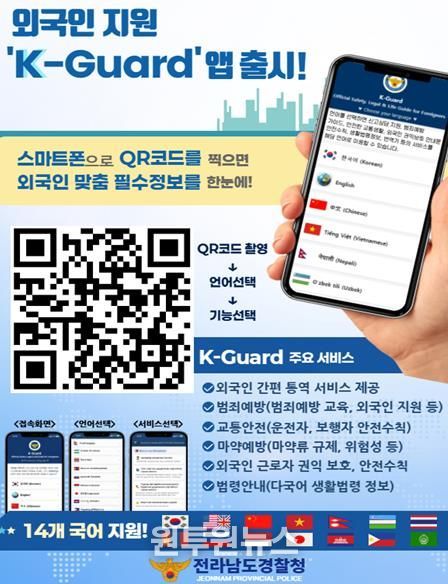 (원투원뉴스) 전남경찰청은 국내 체류 외국인의 범죄·사고 예방과 인권이 존중받는 사회를 위해 외국인 맞춤형 통합 정보제공 앱『K-Guard』를 개발하고, 12월 22일부터 시범운영에 들어간다고 밝혔다.