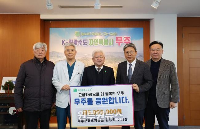 (원투원뉴스) 무주군으로부터 무주군립요양병원을 위탁받아 운영하는 (사)소산 권창영 이사장이 고향사랑기부금 5백만 원을 기탁했다. 이날 기탁식에는 권도훈 무주군립요양병원장과 임원진 등 4명이 함께 해 의미를 더했다.