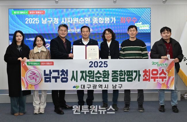 (원투원뉴스) 대구 남구는 2025 대구시 자원순환행정 종합평가에서 9개 구·군 가운데 ‘최우수’(1위)를 차지하며, 자원순환 선도 도시 명품 남구의 위엄을 알렸다.