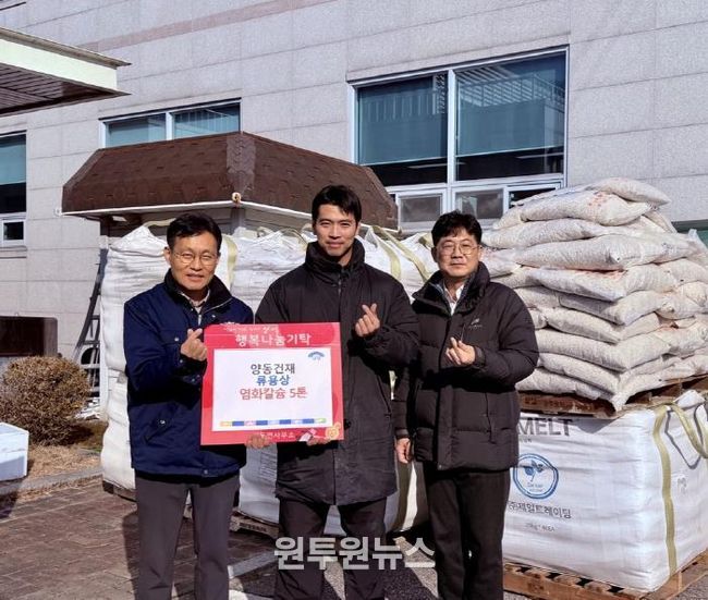 (원투원뉴스) 양평군 양동면은 지난 19일 양동건재 류용상 씨가 양동면사무소를 방문해 겨울철 제설작업에 사용될 염화칼슘 5톤을 기탁하며 지역사회 안전과 이웃사랑 실천에 동참했다고 밝혔다.