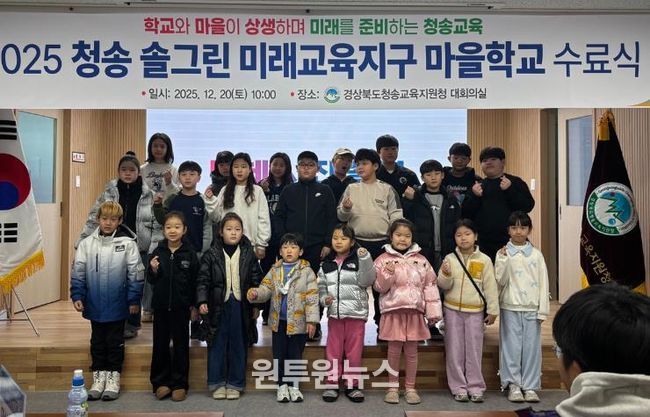 (원투원뉴스) 경상북도청송교육지원청은 12월 20일 청송교육지원청 대회의실에서 3개 마을학교 학생, 마을 교사, 학부모 등 약 100명이 참석한 가운데 2025년 청송 솔그린 미래교육지구 마을학교 수료식을 개최했다.