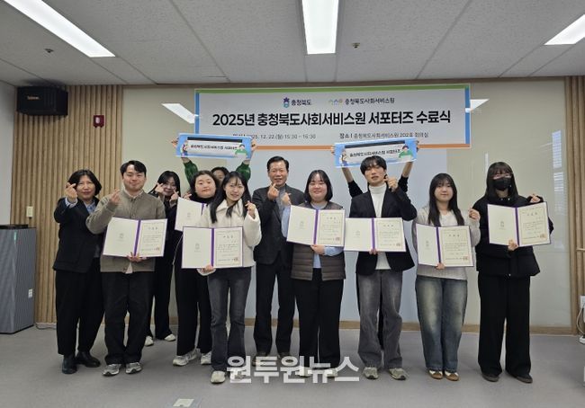 (원투원뉴스) 충청북도사회서비스원(이장희 원장)은 12월 22일 오후 3시 30분, 충청북도사회서비스원 회의실에서 2025년 서포터즈 수료식을 개최했다.