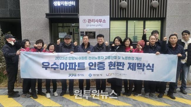 (원투원뉴스) 안양시노동인권센터는 지난 20일 ‘2025년 고용안정 및 노동환경 개선 우수아파트’로 선정된 래미안안양메가트리아와 힐스테이트인덕원역베르텍스 아파트에서 ‘우수아파트 인증 현판식’을 진행했다고 23일 밝혔다.