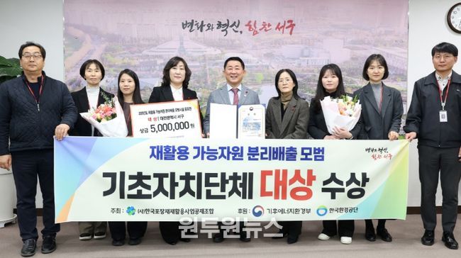 (원투원뉴스) 대전 서구는 22일 ‘2025년 재활용 가능 자원 분리배출 모범시설 공모전’ 기초자치단체 부문에서 대전 자치구 최초로 대상(기후에너지환경부 장관상)을 받았다.