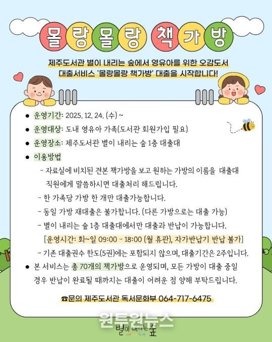 (원투원뉴스) 제주도교육청 제주도서관은 24일부터 영유아 오감도서 대출 서비스 ‘몰랑몰랑 책가방’을 운영한다.